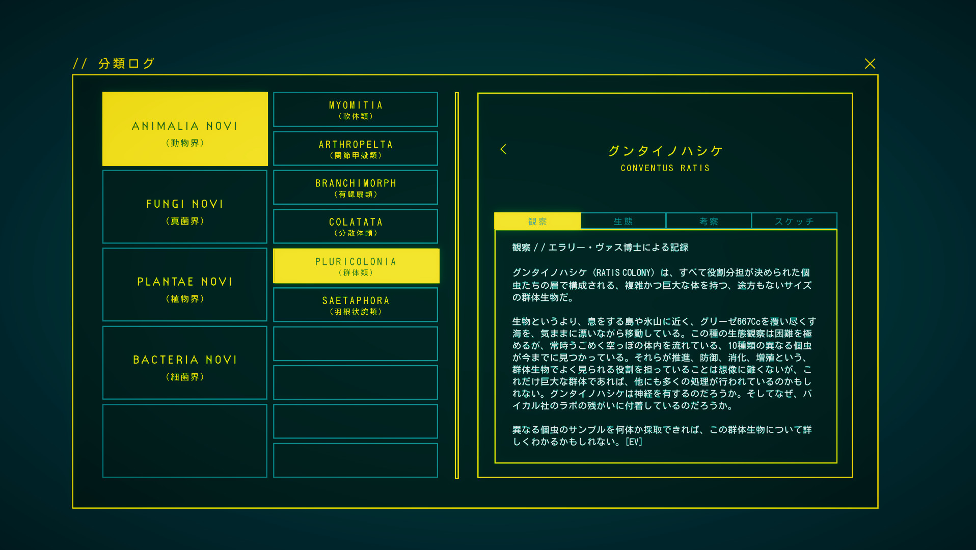人間である博士が探索し、得た情報を AI であるプレイヤーが認識した結果がゲームプレイ画面であり、二人三脚で未知の生態系を探求していくのは想像以上に臨場感があります。